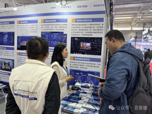 在展览会现场,陕西百容捷的展台吸引了众多行业专家及客户的关注。公司代表向不同领域的合作伙伴详细介绍了最新的技术成果和产品解决方案,特别是3D数字孪生系统、管控一体化平台和AI视觉算法分析系统等关键产品,能够为煤炭的安全高效生产运营提供有力的支持。